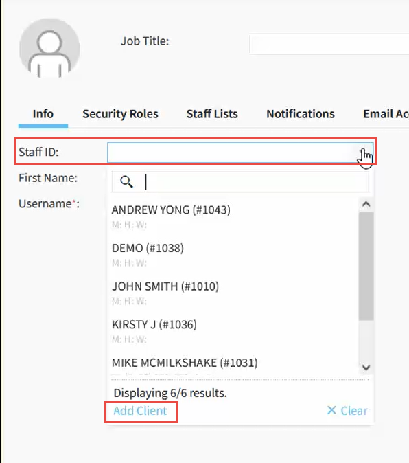- Click in the Staff ID drop down and select the Staff Member from the list. If the staff member hasn't been added in the client list yet, click Add Client and enter the required details.
