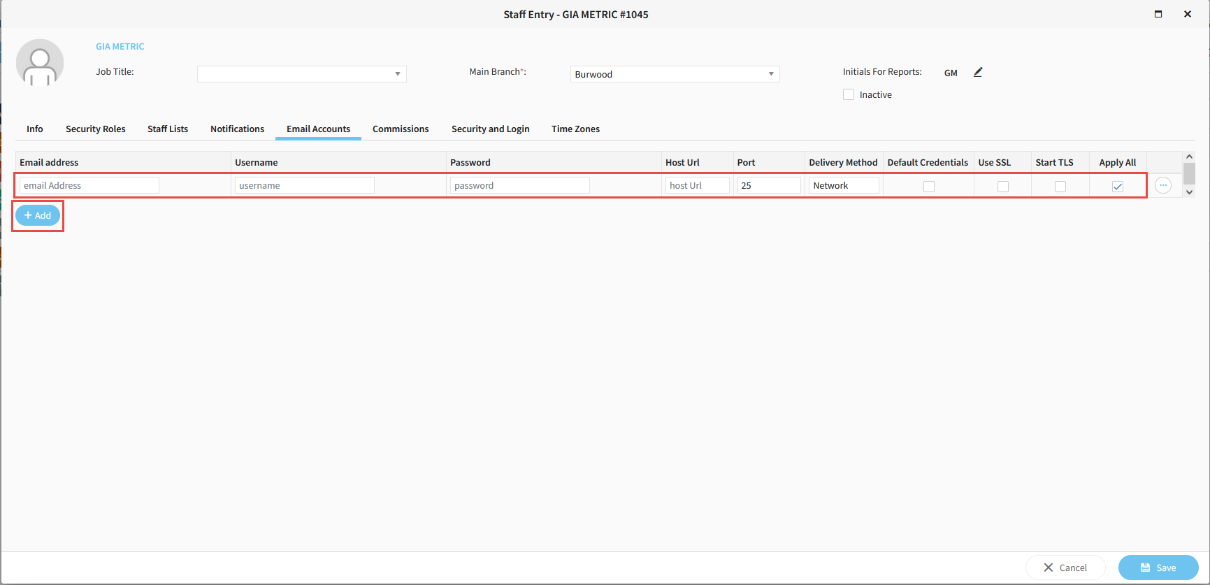 - If the staff member will be sending emails from Aura, navigate to the Email Accounts tab and click Add. Enter Email Settings (you may need to get these details from your IT provider). Click Save.