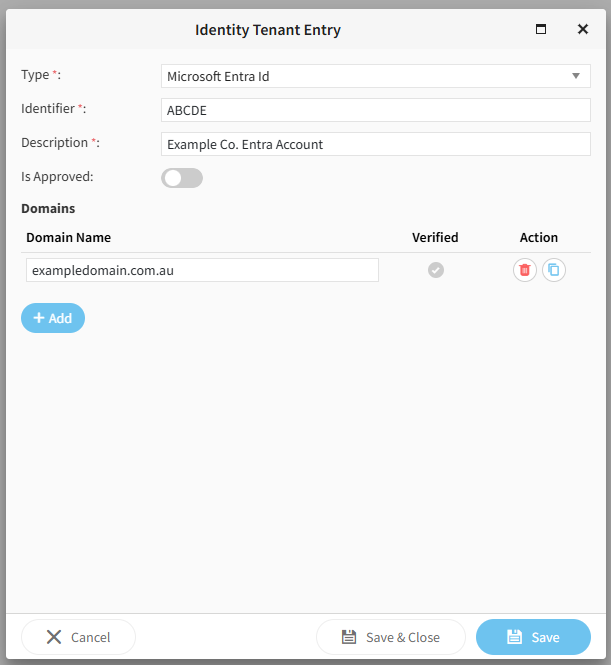 The domain(s) associated with the Entra account needs to be verified by a DNS TXT record and the tenant to be approved. Please contact your website domain name provider for assistance on updating DNS records. Once the TXT record has been added for the domain (click the copy icon for the value), click save and this will attempt to verify the record.