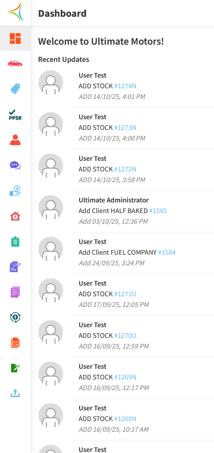 The left hand side displays recent activity made by your dealership, such as adding stock unit and clients.