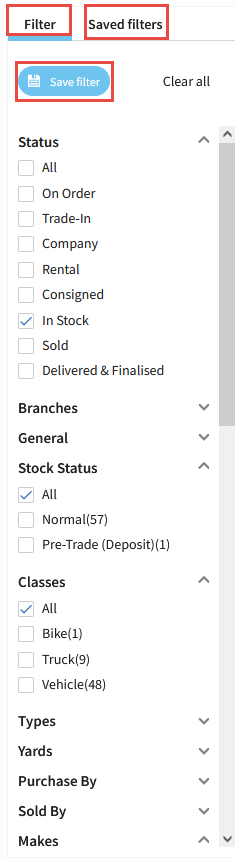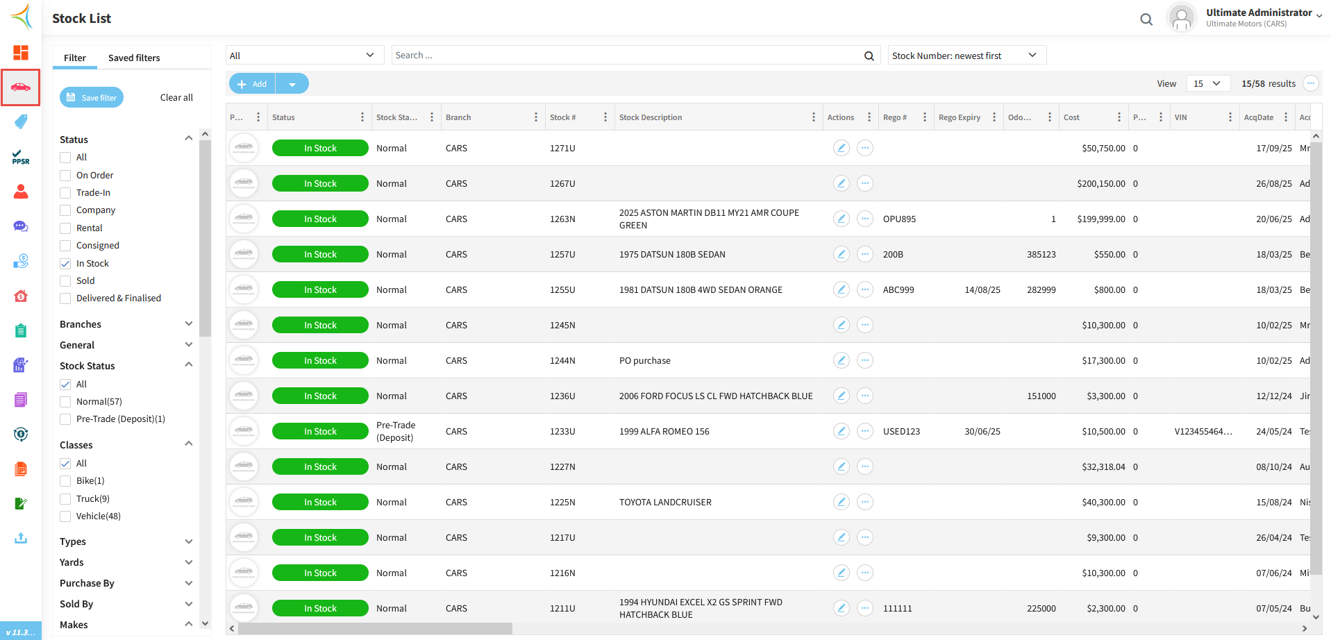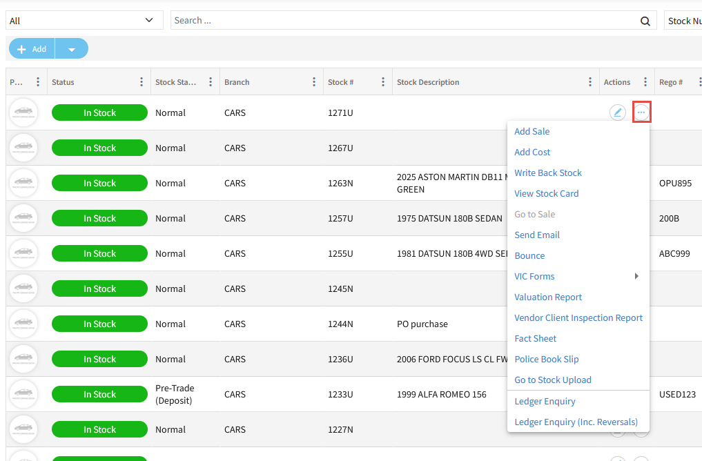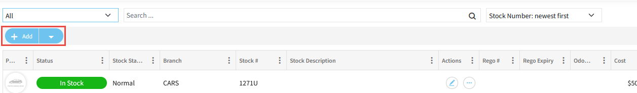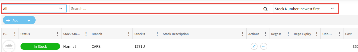The top of the screen is where you can search for a particular stock unit. You can search specifically via Stock Number, Rego etc, or keep it in All to search through all fields.
