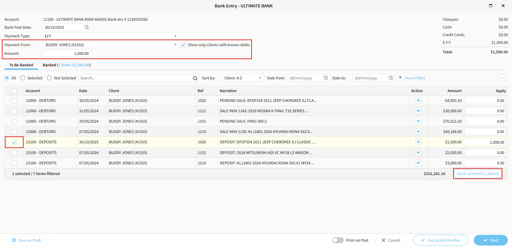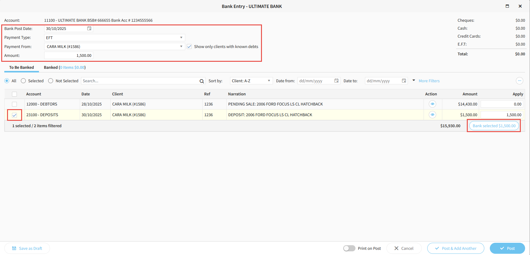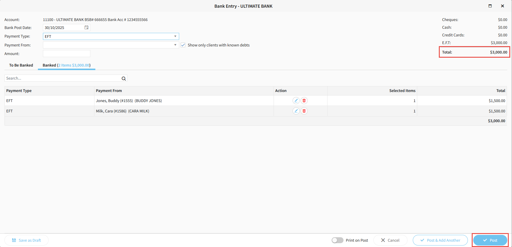 12. When you have marked all the EFTPOS slips as entered, and the total in the top right of the banking screen matches the total on the report, click Post to complete the banking.