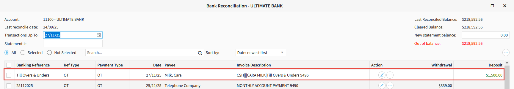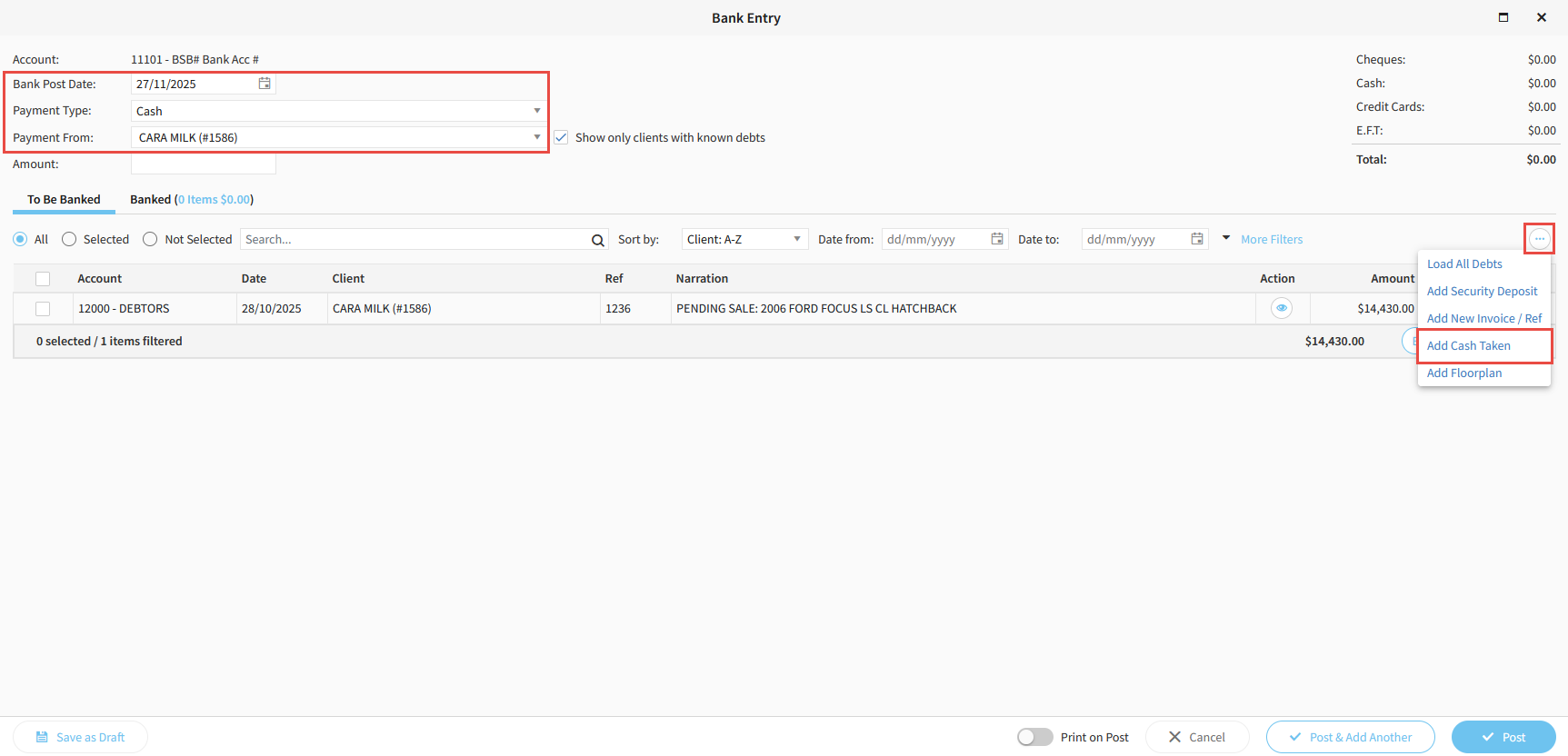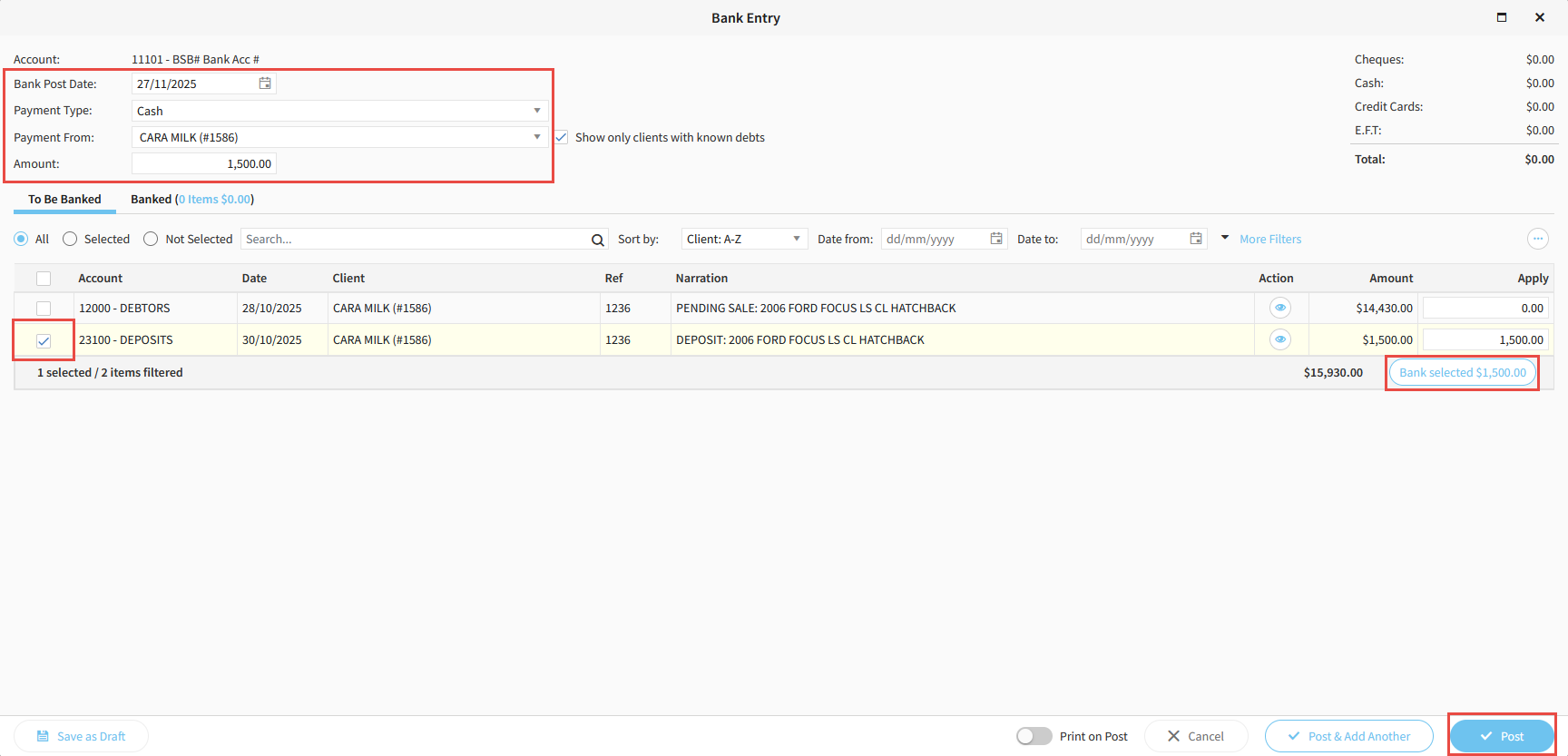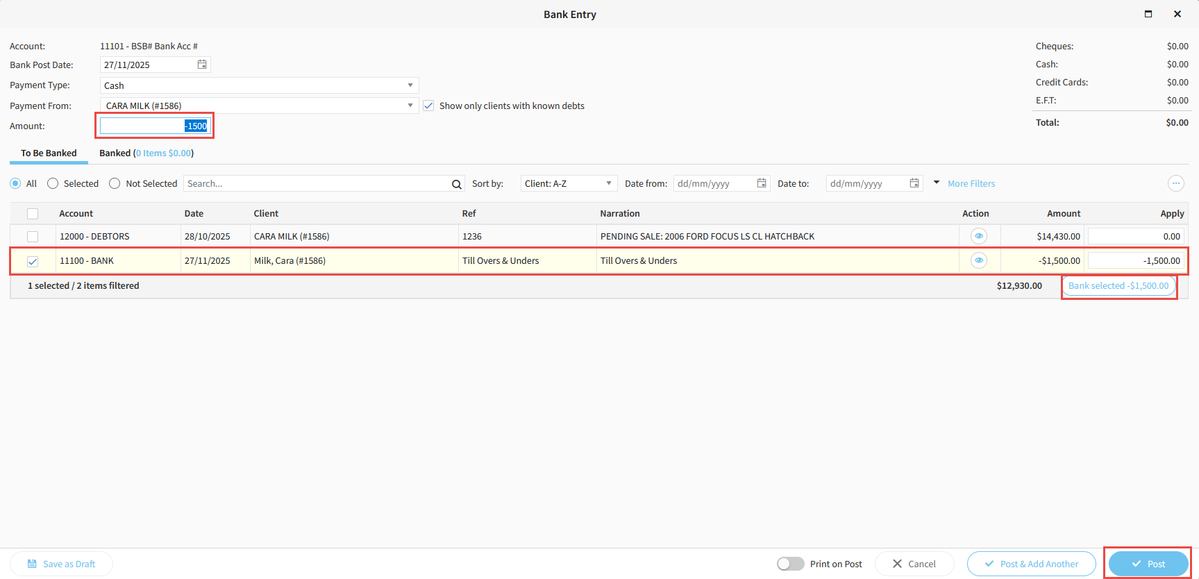 10. Enter a corresponding Negative Amount up the top, then click Bank Selected, then Post.