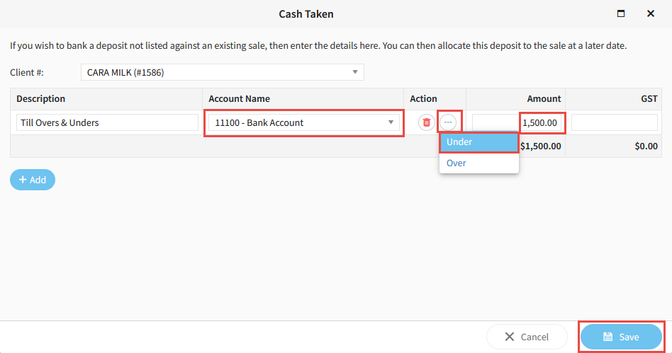 6. Click the 3 dots on the right hand side, then click Add Cash Taken.